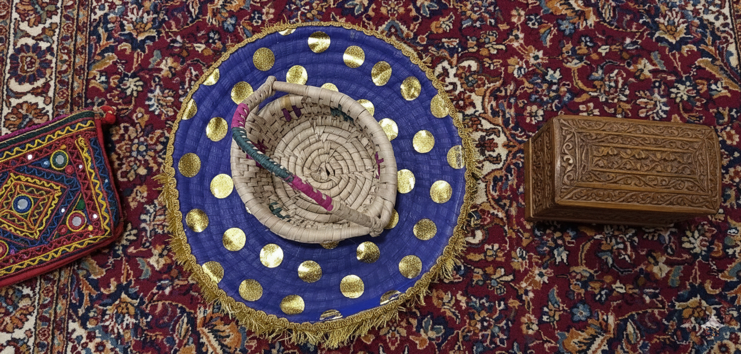 Add a pop of color and tradition to your décor with this handwoven festive tray, paired with a charming natural fiber basket. Crafted by skilled artisans, the round tray features a rich blue base adorned with golden polka accents and finished with elegant gold fringe, giving it a celebratory, desi aesthetic.