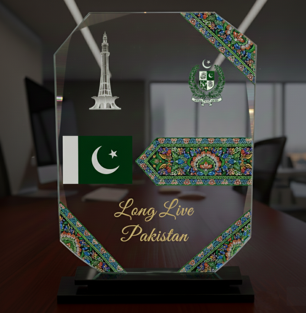 This crystal glass souvenir plaque celebrates Pakistan’s national identity with iconic symbols including Minar-e-Pakistan, the national flag, and traditional Pakistani truck art patterns. A premium decorative piece ideal for gifts, offices, awards, and patriotic displays.